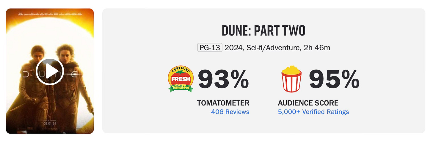 A wide release film like Dune: Part Two currently has 404 reviews aggregated to a 93% “fresh” rating.